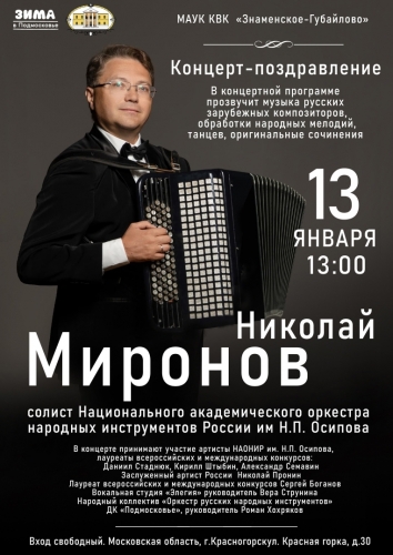 13 января в 13:00 в Главном доме Усадьбы Знаменское-Губайлово состоится Концерт-поздравление солиста Национального академического оркестра народных инструментов России им Н.П. Осипова Николая Миронова.