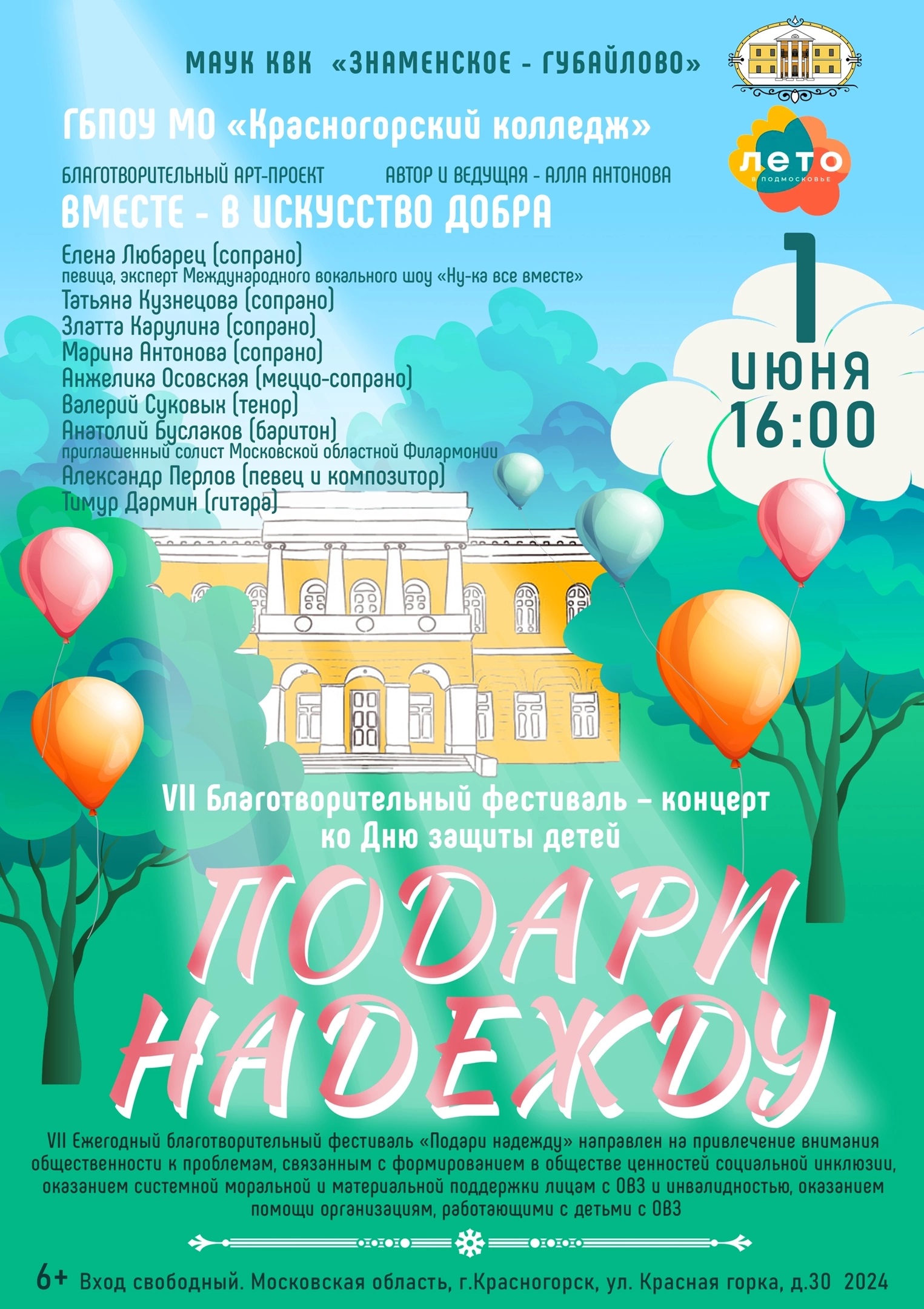 1 июня 2024 в 16:00 в Главном доме Усадьбы Знаменское-Губайлово состоится VII Благотворительный фестиваль – концерт «Подари надежду» ко Дню защиты детей.