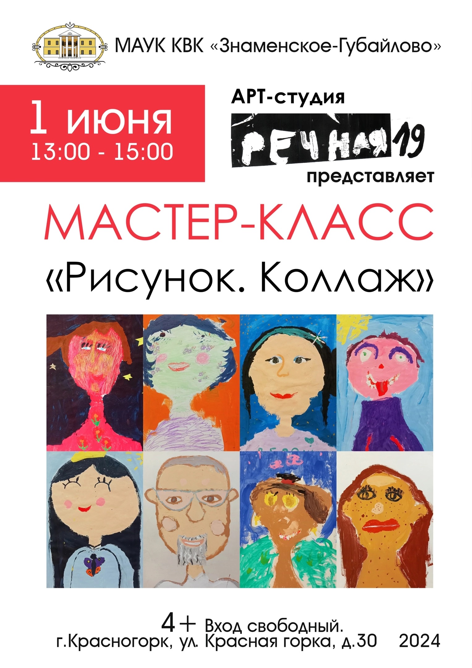 1 июня 2024 года с 13:00 до 15:00 в Главном доме Усадьбы Знаменское-Губайлово состоится Мастер-класс"Рисунок. Коллаж" детской Арт-студии "Речная 19".