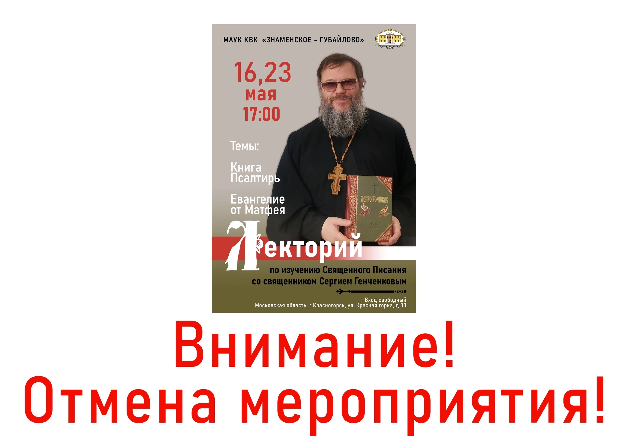 23 мая отменяется лекция из Лектория по изучению Священного Писания со священником Сергием Генченковым.