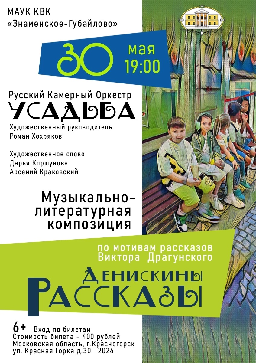 30 мая 2024 года в 19:00 в Главном доме Усадьбы Знаменское-Губайлово состоится Музыкально-литературная композиция по мотивам рассказов Виктора Драгунского «Денискины Рассказы» в исполнении Русского Камерного Оркестра «Усадьба», художественный руководитель: - Роман Хохряков; художественное слово: Дарья Коршунова, Арсений Краковский.