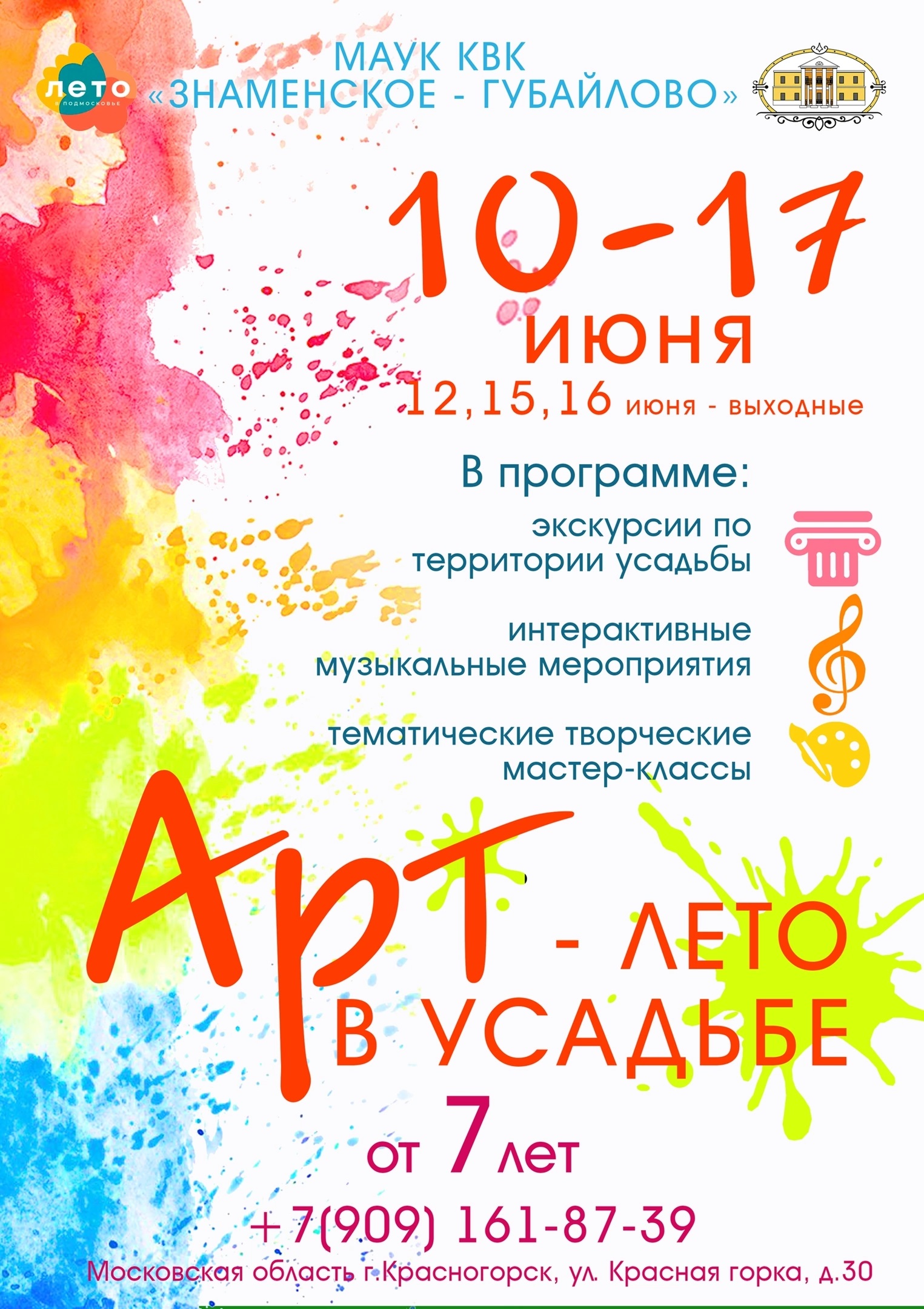«АРТ-лето в Усадьбе» - это вовлечение детей Красногорска в творческую атмосферу через возможность профессионального участия в культурных мероприятиях, знакомство с разыми видами искусств, проведение тематических художественных мастер-классов, экскурсий, лекториев и встреч с художниками, музыкантами, архитекторами.