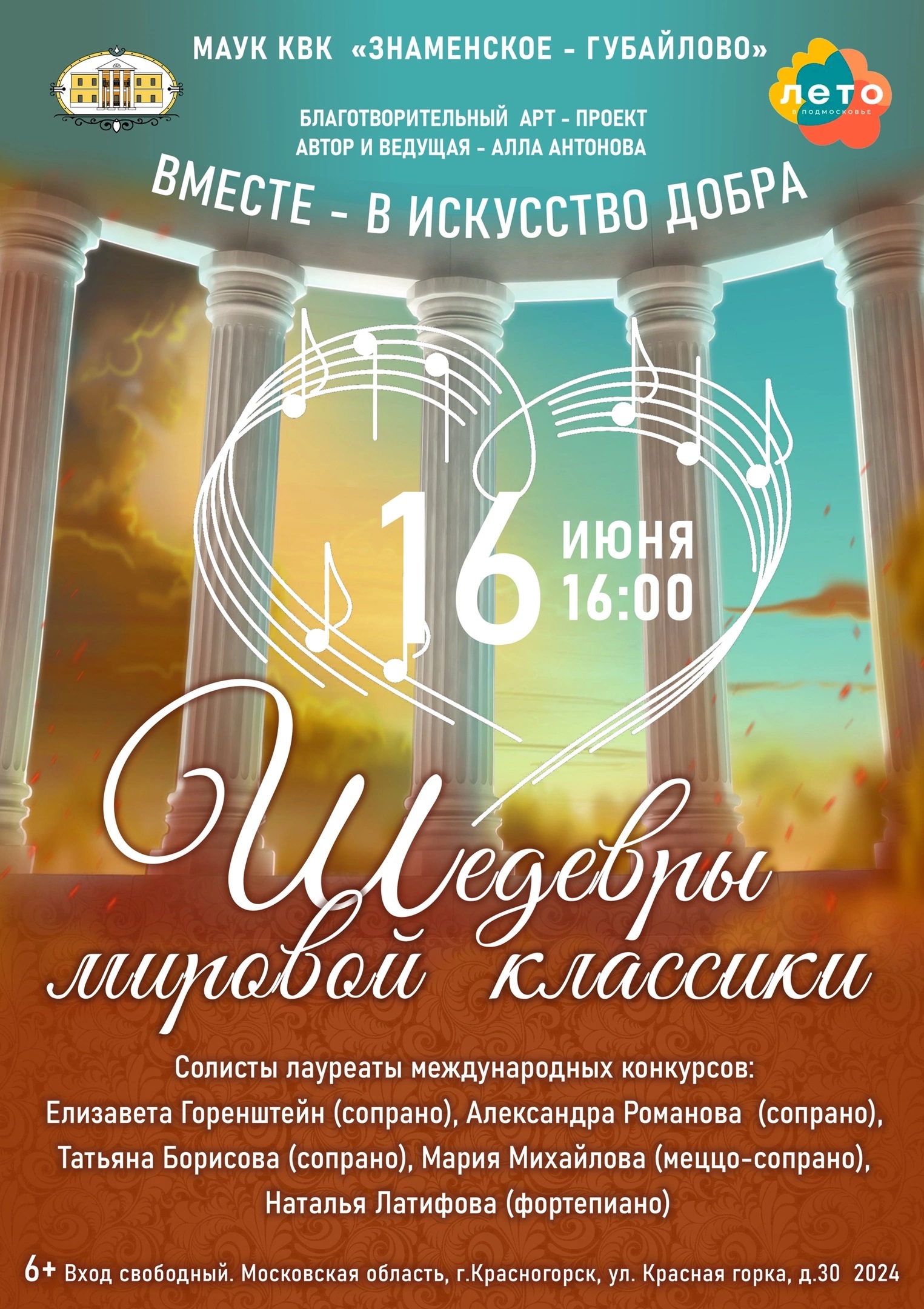 16 июня 2024 года в 16:00 состоится Концерт «Шедевры мировой классики» Арт-проекта «Вместе в искусство добра», автор и ведущая - Алла Антонова.