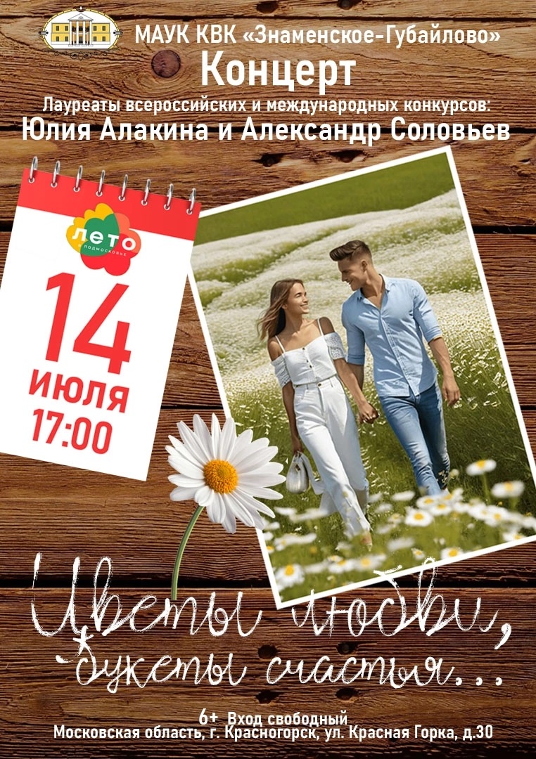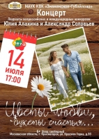 14 июля в 17:00 приглашаем вас на Концертную программу «Цветы любви, букеты счастья...» Лауреатов Всероссийских и международных конкурсов Юлии Алакиной и Александра Соловьева.