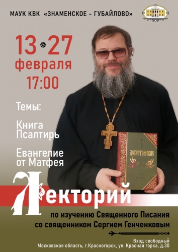 13 и 27 февраля 2025 года в 17:00 в Главном доме Усадьбы Знаменское-Губайлово состоится лекция из Лектория по изучению Священного Писания со священником Сергием Генченковым.