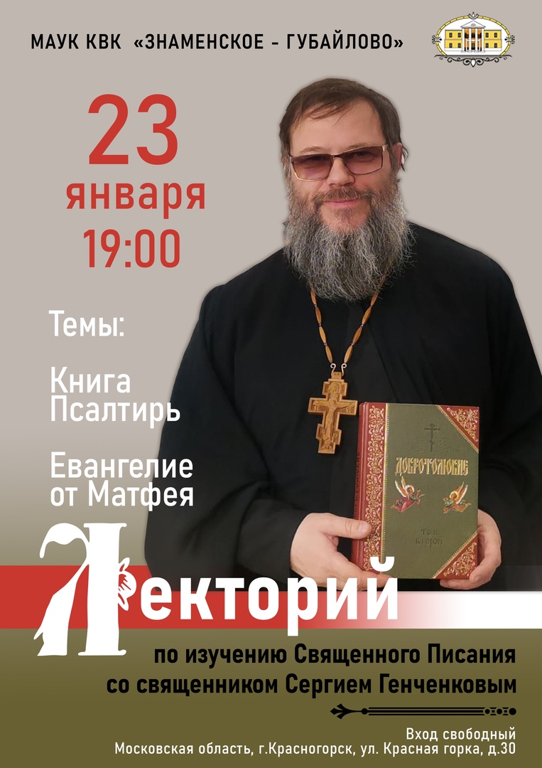 23 января 2025 года в 19:00 в Главном доме Усадьбы Знаменское-Губайлово состоится лекция из Лектория по изучению Священного Писания со священником Сергием Генченковым.