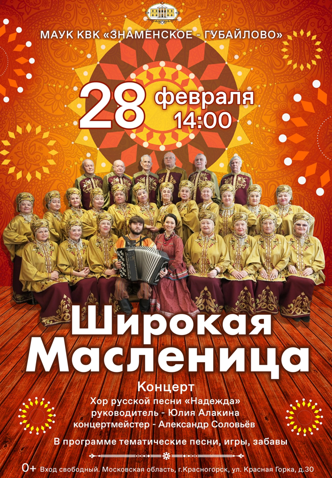 28 февраля 2025 года в 14:00 в Главном доме Усадьбы «Знаменское-Губайлово», при участии Хора русской песни «Надежда», состоится Концерт «Широкая Масленица»