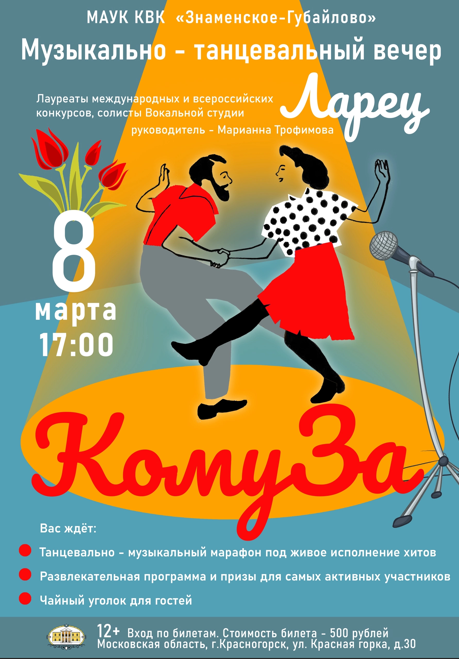 8 марта 2025 года в 17:00 в Главном доме Усадьбы Знаменское-Губайлово состоится Праздничный музыкально - танцевальный вечер " КомуЗа".