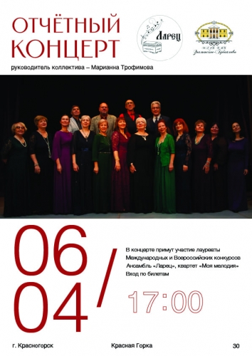 В Усадьбе Знаменское - Губайлово 6 апреля в 17.00 состоится отчетный концерт вокальной студии "Ларец", руководитель Марианна Трофимова.