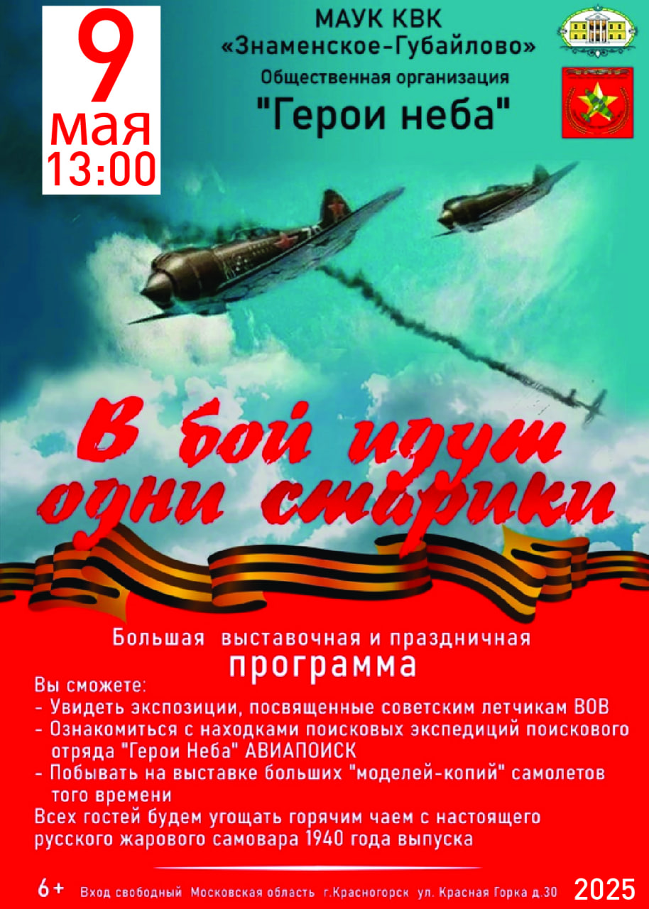 В рамках праздничных мероприятий посвященных 80 летию Победы в Великой Отечественной Войне. Красногорская Общественная организация "Герои неба" и Культурно-выставочный комплекс "Знаменское-Губайлово" проведут большую выставочную и праздничную программу "В бой идут одни старики! ".