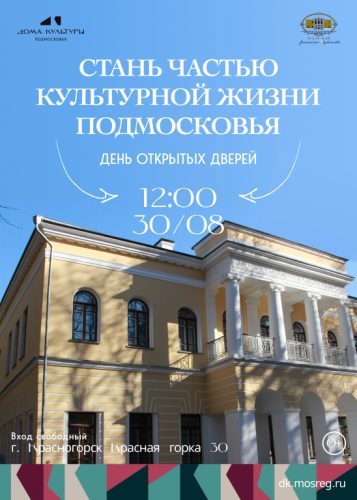 30 августа в 12:00 приглашаем вас на День открытых дверей в Усадьбу Знаменское-Губайлово и в Дом культуры «Салют» (г.о. Красногорск, ул. Первомайская, д. 8).