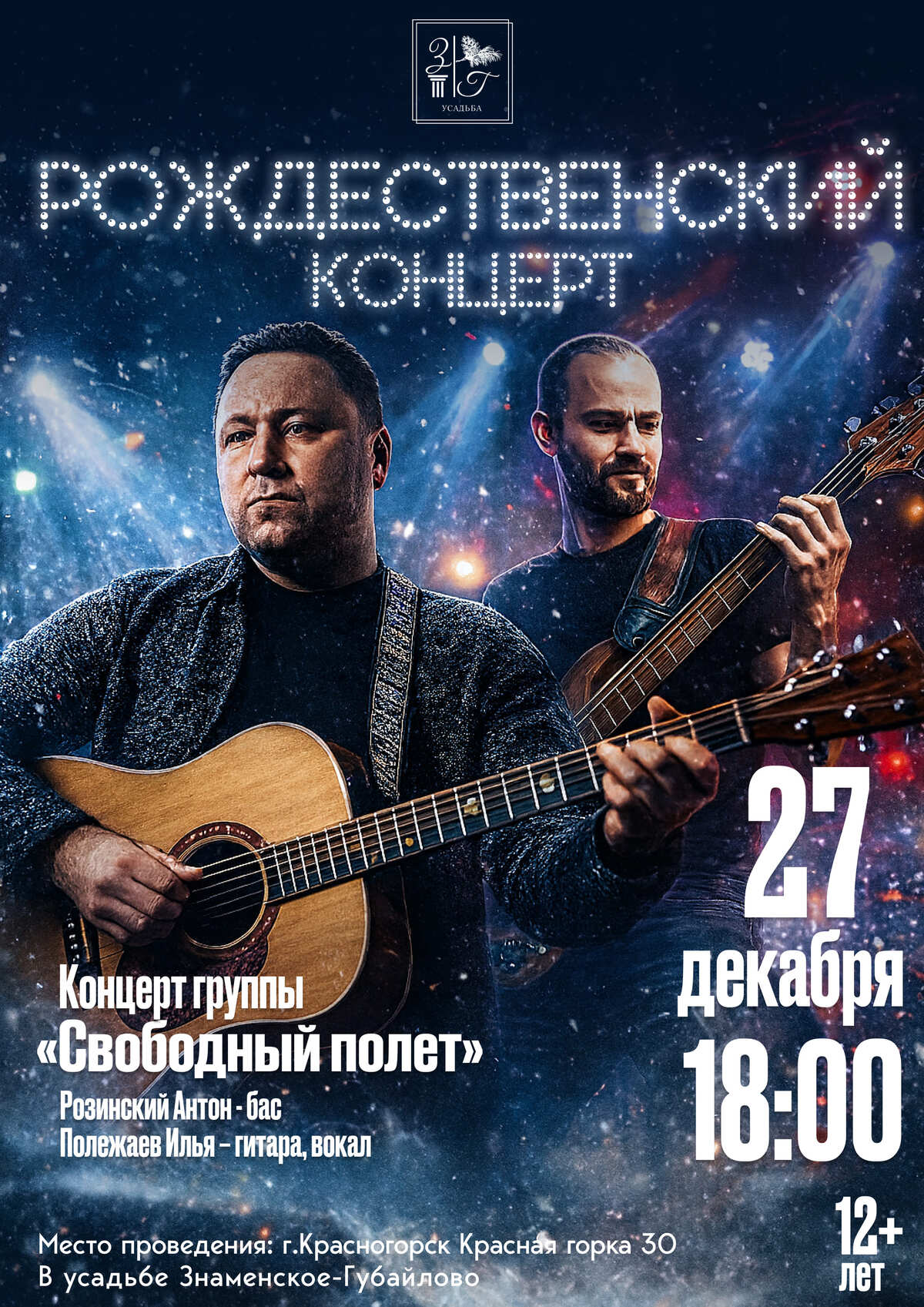 27 декабря в 18:00 в усадьбе «Знаменское-Губайлово» состоится атмосферный рождественский вечер с группой «Свободный полёт».