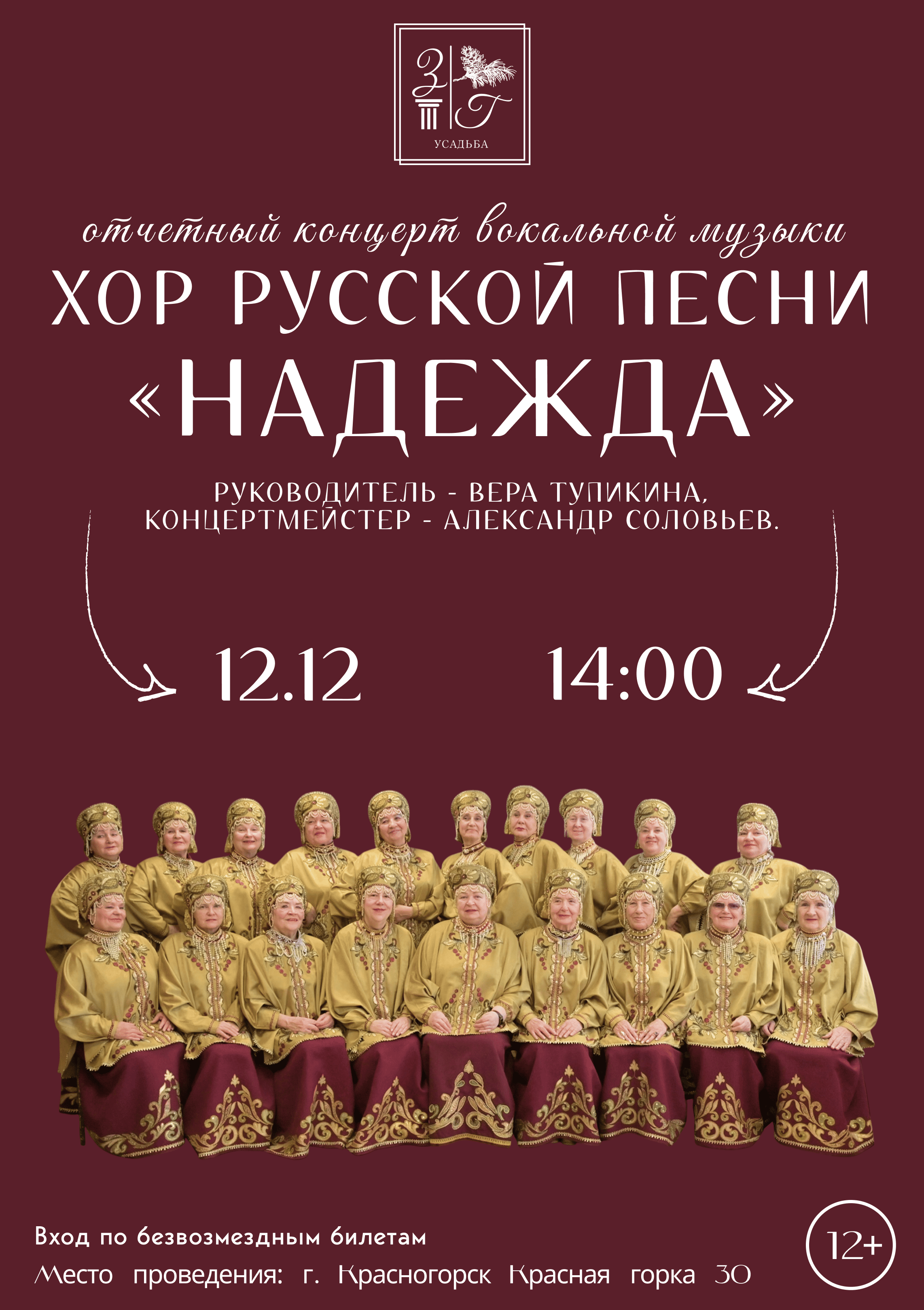 12 декабря в 14:00 в главном доме усадьбы «Знаменское-Губайлово» состоится отчётный концерт хора русской песни «Надежда» под руководством Веры Тупикиной. За фортепиано — Александр Соловьёв.
